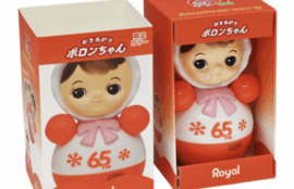 ポロンちゃんは1960年に誕生した、赤ちゃん用の「おきあがりこぼし」で、特に昭和のベビーブームでは出産祝いの定番として、絶大な人気を誇り、子育て世帯から親しまれるおもちゃでした。1969年には、某国民的アニメの漫画連載が開始し、その主人公誕生のヒントとなったのがポロンちゃんでした。(実際に発売された漫画や映画にもポロンちゃんが登場) 材質や表情に変更を重ねながら現在まで親しまれていたポロンちゃんは、2021年に昭和レトロブームが到来し、ケンエレファント社が発売する「昭和ノスタルジック」ミニチュアコレクションより、ポロンちゃんのカプセルトイ第一弾が発売されました。長年親しまれてきたポロンちゃんのファン層は厚く、カプセルトイも人気になり、その後はポロンちゃんだけのカプセルトイも発売され、4年間で約20万個が製造されました。